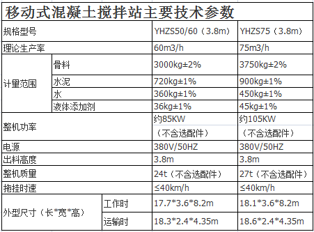 移動(dòng)式混凝土攪拌站型號(hào)字母含義:YHZS中:Y-移動(dòng)式、H-混凝土、Z-攪拌站、S-采用雙臥軸主機(jī);因此其正式名稱為"移動(dòng)式混凝土攪拌站"。簡稱"移動(dòng)式攪拌站"。